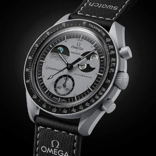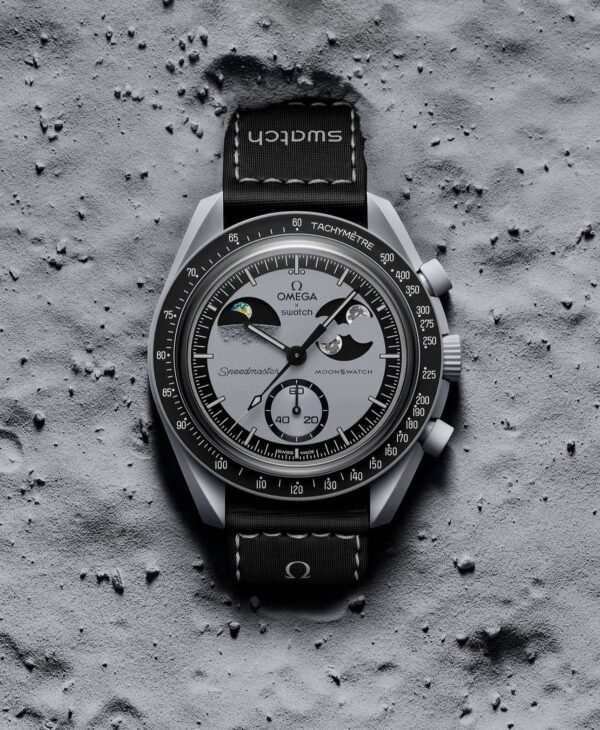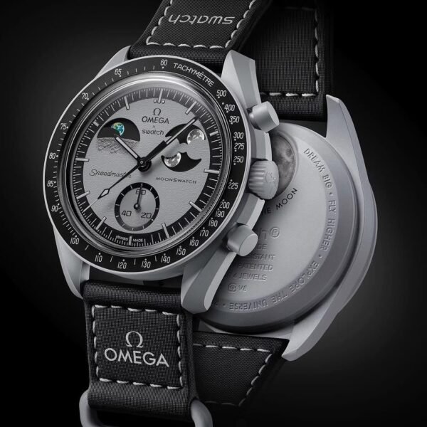 his non-limited chronograph features a light gray Bioceramic case, crown and pushers as well as a black VELCRO® strap with contrasting light gray topstitching and Bioceramic loop. It has a gray dial with a grainy texture that resembles the lunar surface. This timepiece has a tachymeter scale in a sleek black hue with markers in a newly created light gray color. In celebration of the Moon and the Earth, it boasts both a moon phase and a patented earth phase function. Two oversized moons with Super-LumiNova® (white emission) can be seen on the moon phase disc, which rotates in the subdial set at 2 o’clock. The earth phase function located in the subdial at 10 o’clock is colored. Adding an otherworldly touch, the oceans are coated with UV ink, that emit a blue glow under UV light. An image of the Moon can be found on the battery cover complete with the footprint of Neil Armstrong—the first man to set foot there. The dials of every watch in this collection carry the OMEGA X Swatch branding, the iconic Speedmaster logo and the MoonSwatch logo. Also common to all models are the box-shaped biosourced glass construction, the etched “S” in the center of the glass referencing the Swatch logo, the fine and sophisticated circular pattern on the dial outer ring and the recessed subdials, the sharp and smooth lugs construction and of course the unique Bioceramic feel. The hour markers, hour and minute hands and the tip of the chronograph seconds hand are coated with light gray Grade A Super-LumiNova® for a perfect glow in the dark (green emission).